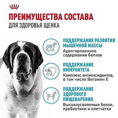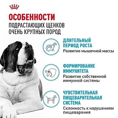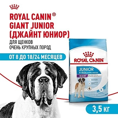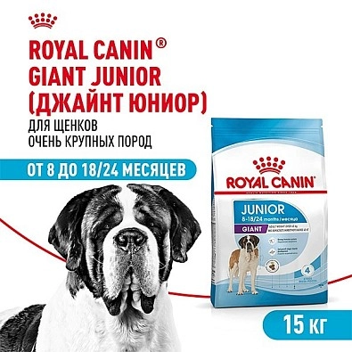 Формула продукта ROYAL CANIN® Giant Junior разработана с учетом потребностей щенков очень крупных пород (вес взрослой собаки больше 45 кг) и подходит для щенков в возрасте от 8 до 18/24 месяцев. Специально разработанный рацион содержит питательные вещества, необходимые щенку очень крупных размеров.