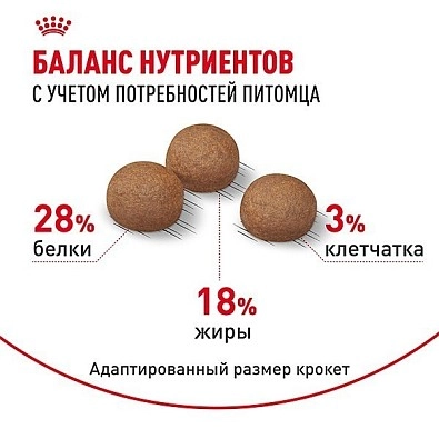 СОДЕРЖАНИЕ ПИТАТЕЛЬНЫХ ВЕЩЕСТВ: Белки: 28,0 % - Жиры: 18,0 % - Минеральные вещества: 6,0 % - Клетчатка пищевая: 3,0 %.