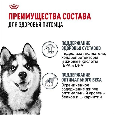 Корм предназначен для собак с повышенной чувствительностью суставов (весом от 26 до 44 кг). ROYAL CANIN® Joint Care Maxi содержит сниженное количество калорий, способствуя снижению веса животного.