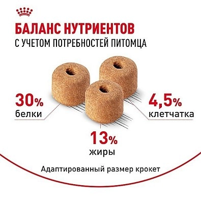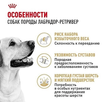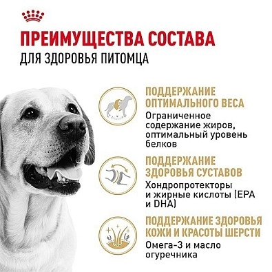Благодаря оптимальной калорийности, корм насыщает собаку энергией, но без излишков, поэтому ваш лабрадор-ретривер останется стройным и подвижным. Рецептура корма помогает поддержать целостность хрящевых тканей и связок, сохранить красоту и здоровье кожи и шерсти. Благодаря адаптированной форме сухариков, собака насыщается меньшим объемом порции.