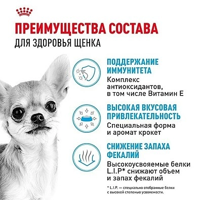 Кроме того, формула ROYAL CANIN® Chihuahua Puppy содержит множество полезных питательных веществ, способствующих здоровому пищеварению щенка. Идеальное сочетание нутриентов позволяет уменьшить как объем стула, так и его запах!