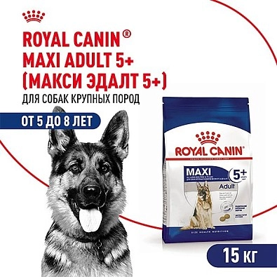 Макси Эдалт 5+: полнорационный сухой корм для стареющих собак крупных размеров (вес собаки от 25 до 45 кг) в возрасте от 5 до 8 лет. Адаптированное содержание питательных веществ помогает сохранять нормальное функционирование организма у собак крупных пород, проявляющих первые признаки старения. Содержит специальный комплекс антиоксидантов, способствующий нейтрализации свободных радикалов.