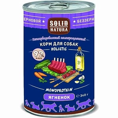 Консервы Solid Nature ценятся владельцами собак за доступную стоимость. Аппетитное угощение имеет приятный вкус и аромат. Консервы сделаны на основе нежирного мяса ягнёнка. Продукт используют как добавки к каше или овощам, подают как отдельное блюдо. Консервы подходят мелким, средним, крупным породам собак.