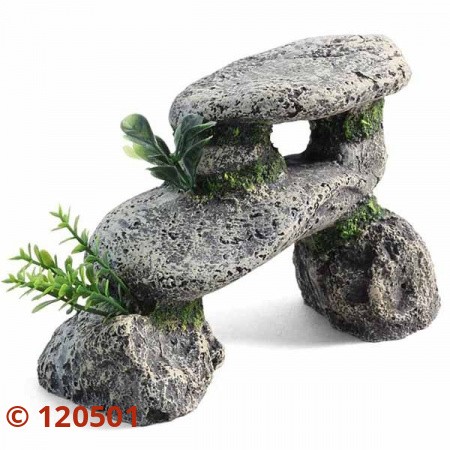 Материал изделия — безопасная синтетическая смола. Современные полиэфирные смолы безопасны для обитателей аквариума, они не влияют на жесткость воды и ее химические свойства. Смола великолепно имитирует поверхность камня, которая не выцветает и не трескается с годами. Кустики растений выполнены из нетоксичного пластика. Параметры арки 13,5*6,5*9,5 сантиметров.