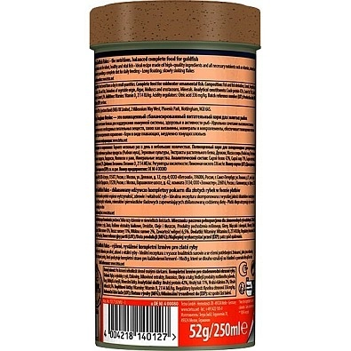 Высокопитательные хлопья для всех разновидностей золотых рыбок, а также других видов холодноводных рыб, обитающих в аквариуме или пруду. Универсальный рацион учитывает основные особенности пищеварения золотых карасей: отсутствие истинного желудка с высокой кислотностью, трудности с перевариванием протеинов, потребность в легкоусвояемых углеводах, а также повышенную склонность к газообразованию, запорам и воспалительным процессам в органах пищеварения.