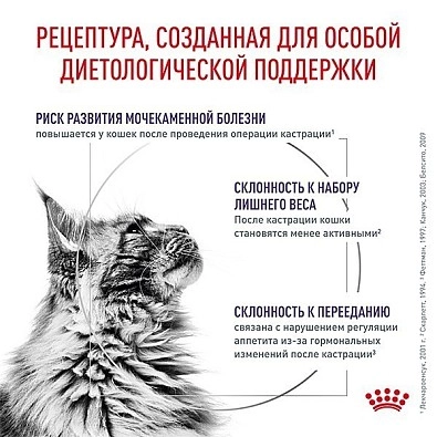 У стерилизованной кошки по сравнению с нестирилизованной в 7 раз повышается риск образования оксалатов кальция и в 3,5 раза - образования струвитов. В первые 48 часов после кастрации/стерилизации количество потребляемого корма у кошек начинает увеличиваться, что может со временем привести к ожирению. Моча становится более концентрированной и застаивается в мочевом пузыре. Это создает идеальные условия для образования камней.