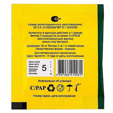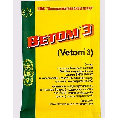 «Ветом» 3 содержит штаммы бактерий, обладающих высокой резистентностью к кислой среде желудка, пищеварительным ферментам и другим неблагоприятным условиям, при этом имеют выраженные антагонистические качества по отношению к широкому спектру болезнетворных микроорганизмов.
