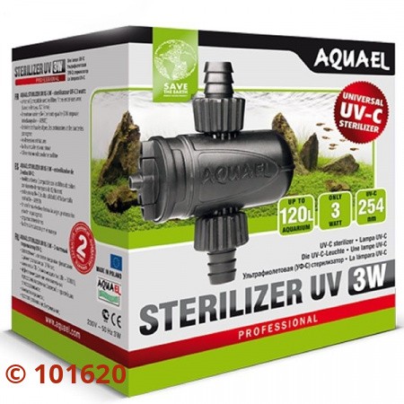 Проточный стерилизатор UV C от польской торговой марки Aquael, используется вне воды. Устройство закрепляется снаружи и подсоединяется к выходному шлангу фильтрующего устройства — вода после прохождения всех этапов очистки в фильтрующем устройстве, обрабатывается кварцевой лампой, для уничтожения водорослей, грибков, бактерий и других организмов, которые могут негативно сказаться на экосистеме аквариума. Ультрафиолетовая обработка затрагивает исключительно микроорганизмы присутствующие в воде в виде взвеси, и не влияет на гидробионтов, растения, нитрифицирующих бактерий.