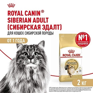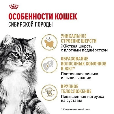 Крепкая, хорошо сложенная сибирская кошка - национальное достояние России и непременная героиня народных сказок. Её плотная шерсть с двойным подшерстком действительно водонепроницаема: она обладает водоотталкивающими свойствами. Рацион ROYAL CANIN® Siberian Adult учитывает эту особенность, поэтому содержит комплекс разнообразных питательных веществ, в том числе, аминокислот, витаминов, жирных кислот Омега-3 и Омега-6, благодаря чему поддерживается здоровье кожи и красота шерсти.