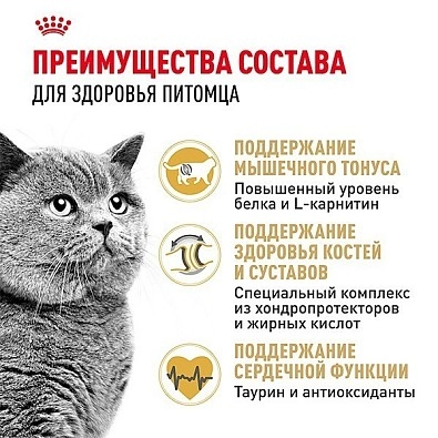 Высокий уровень содержания белков в ROYAL CANIN® British Shorthair Adult адаптирован для поддержания их мышечной массы.