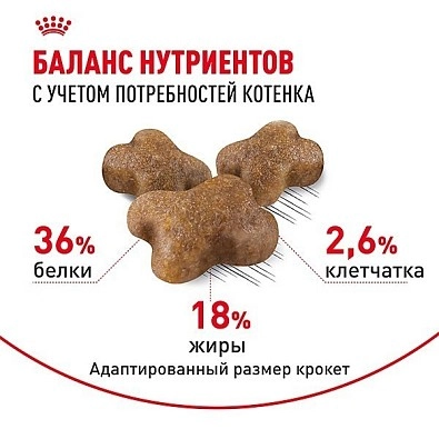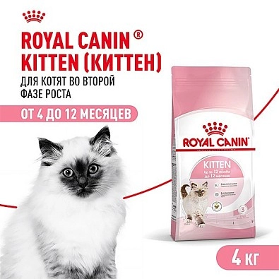 Продукт ROYAL CANIN® Kitten разработан с учетом потребностей в питательных веществах котят в возрасте от 4 до 12 месяцев, вступающих в период значительных перемен физического состояния и поведения.
